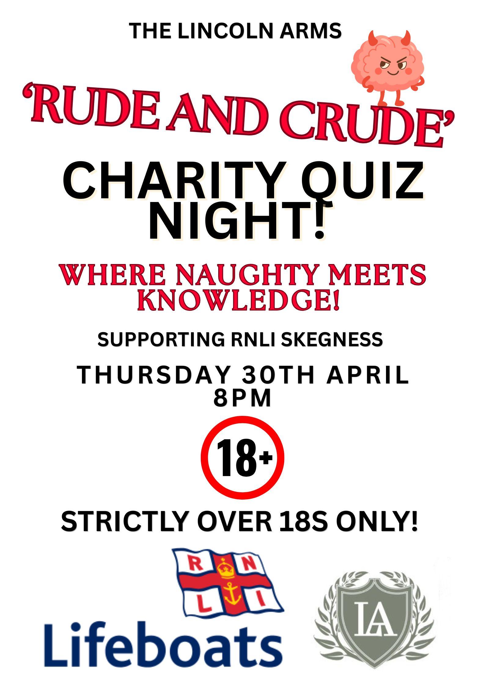 - Thursday 30th April - 'Rude and Crude' Charity Quiz Night - in aid of the RNLI. 8pm start - £2 per person to enter, maximum team size of 6. Lots of fun!